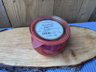 Eingelegte Paprika sind kleine Stücke Paprika, die in etwas Essig-Öl eingelegt sind. Sie schmecken mild und leicht säuerlich.